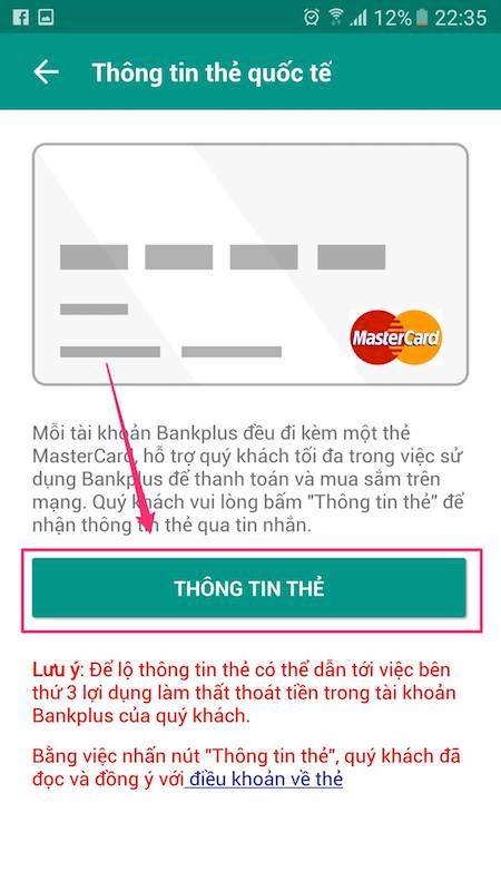 Sẽ có thông báo rằng mỗi tài khoản BankPlus sẽ đi kèm một thẻ MasterCard hỗ trợ trong việc sử dụng BankPlus để thanh toán. Bạn nhấp vào THÔNG TIN THẺ